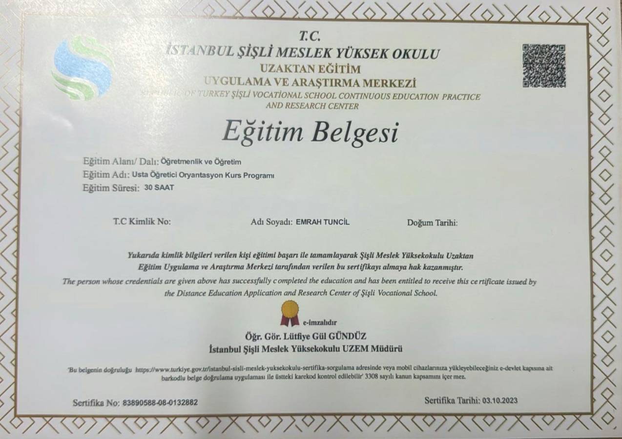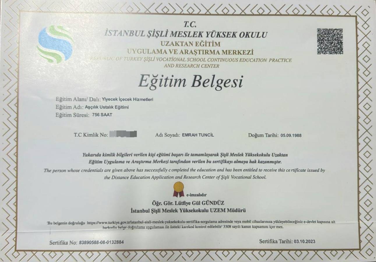 Aşçılık Usta Öğretici Belgesi
